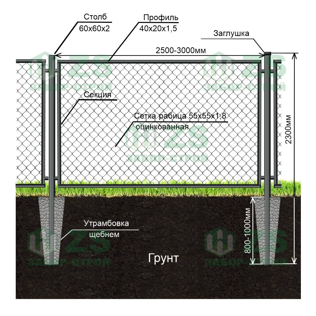 Конструкция забора секционная из сетки рабицы в натяг: