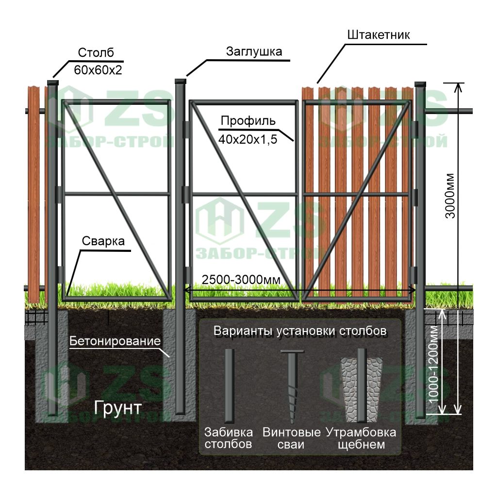 Конструкция забора из профнастила с бетонированием столбов: