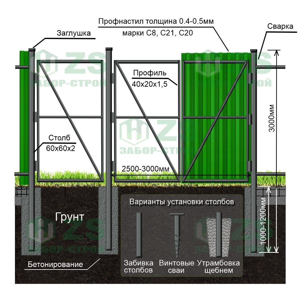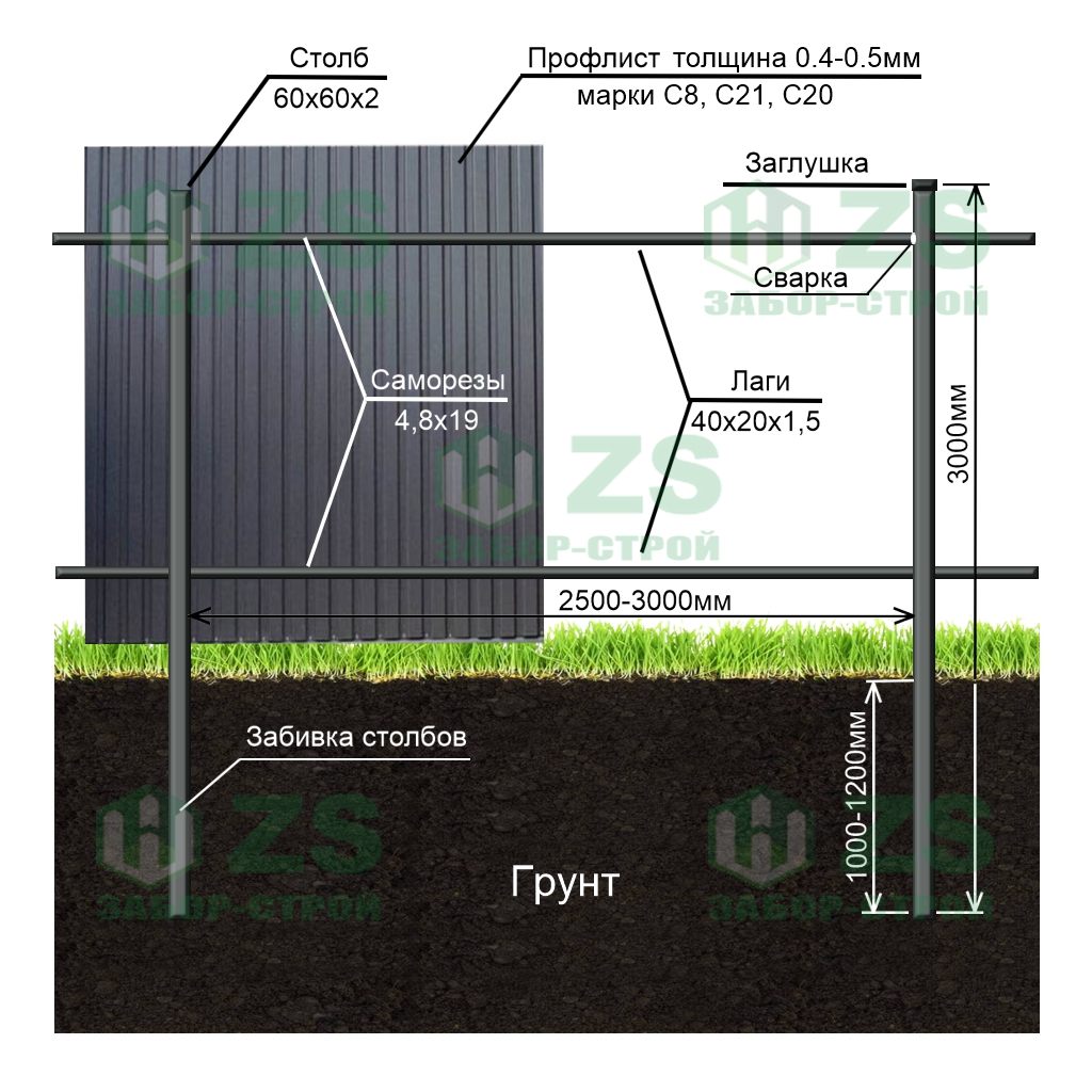 Конструкция забора из профнастила на забивных столбах:
