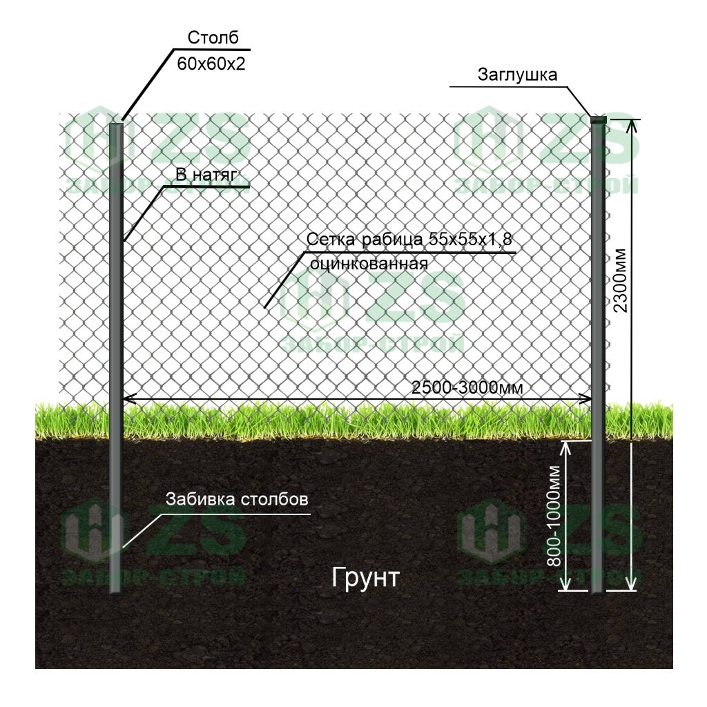 Конструкция забора из сетки рабицы в натяг: