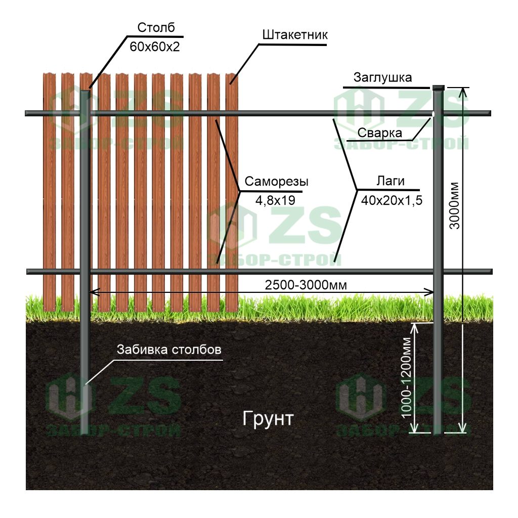 Конструкция забора из евроштакетника на забивных столбах: