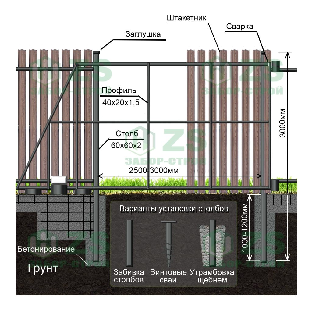 Конструкция забора из евроштакетника на забивных столбах: