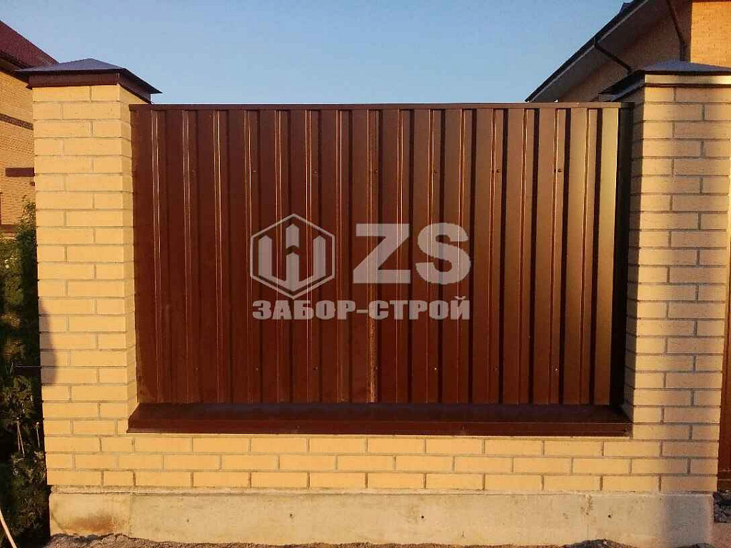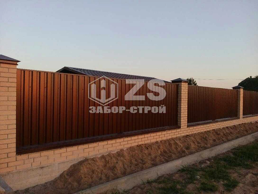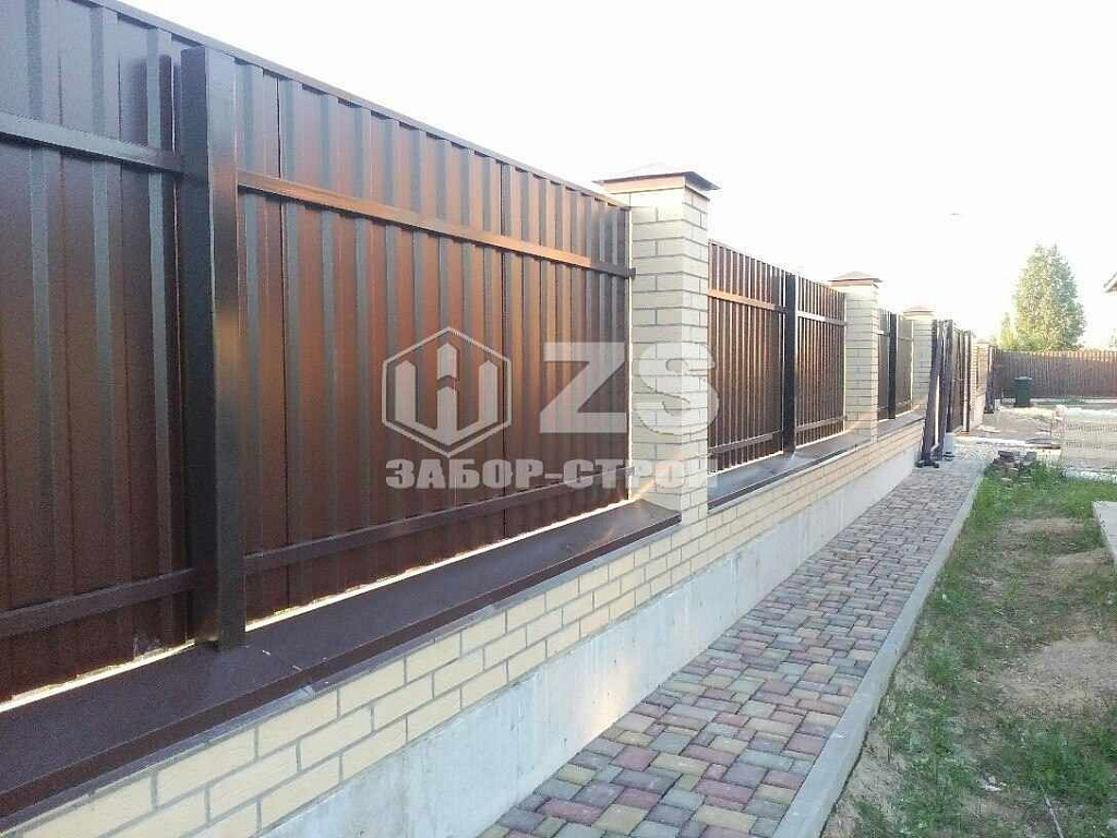 - Забор с кирпичными столбами из профнастила 10 соток