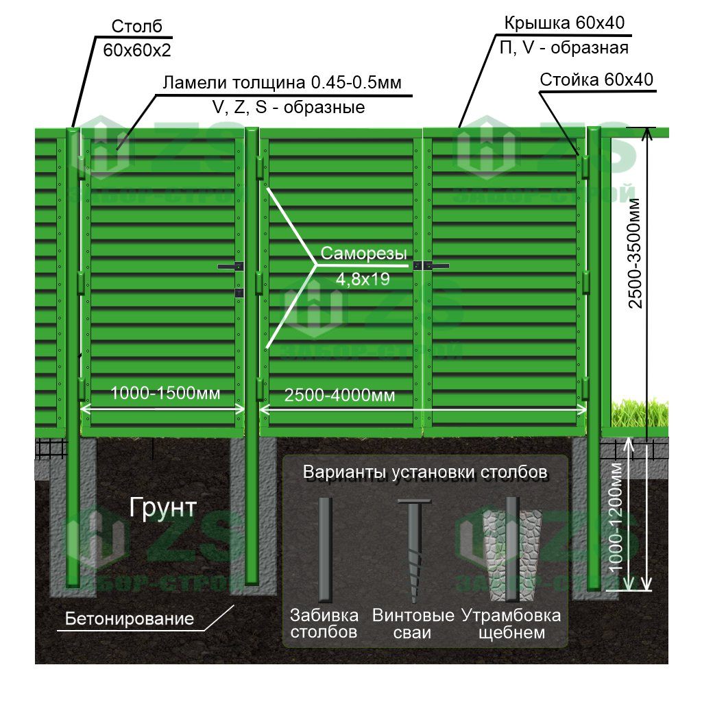 Конструкция забора жалюзи с бетонированием столбов: