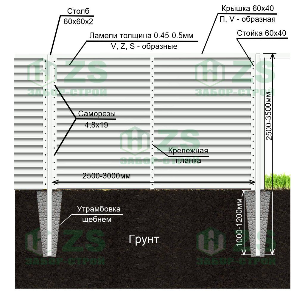 Конструкция забора жалюзи с утрамбовкой щебнем: