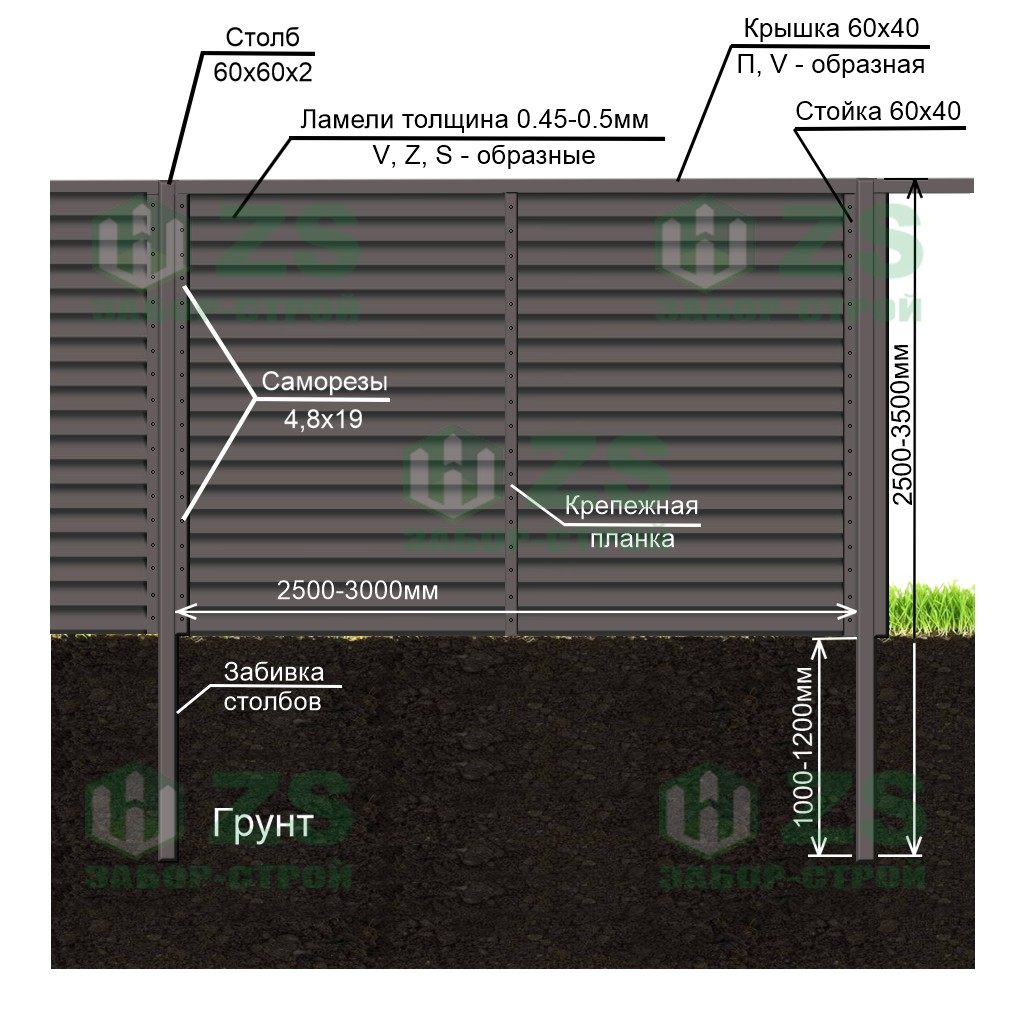 Конструкция забора жалюзи на забивных столбах: